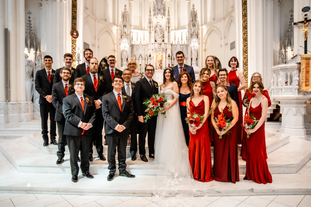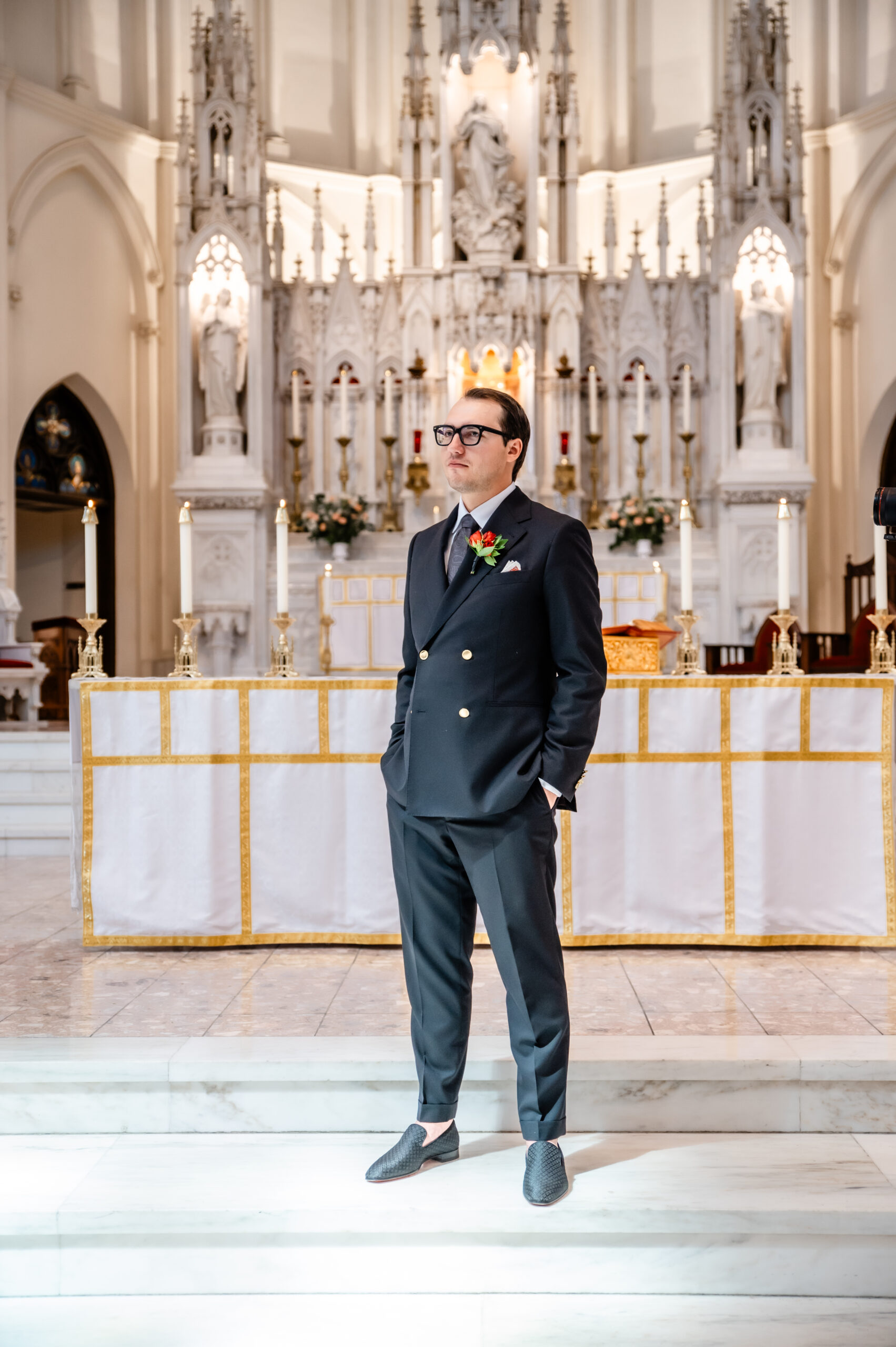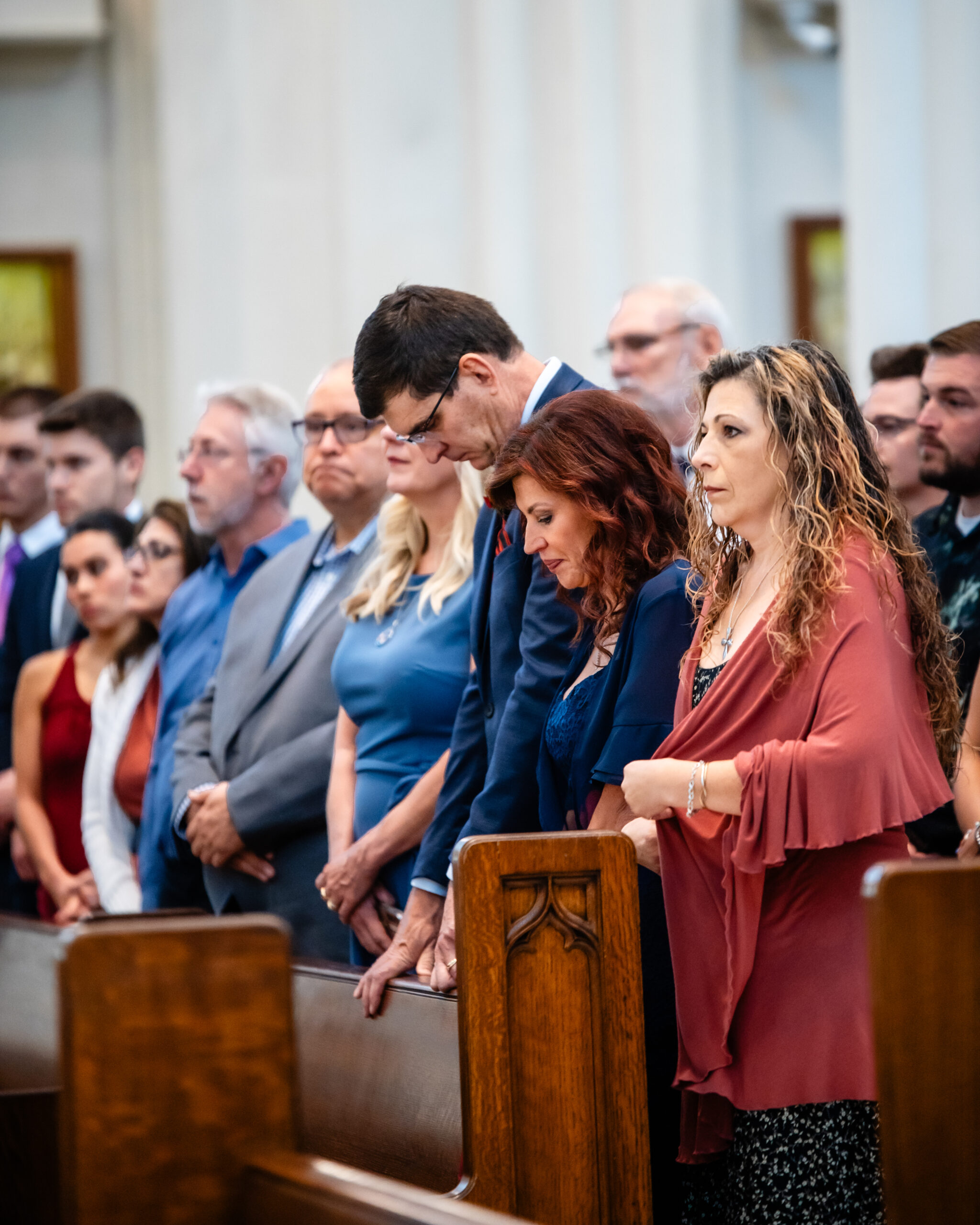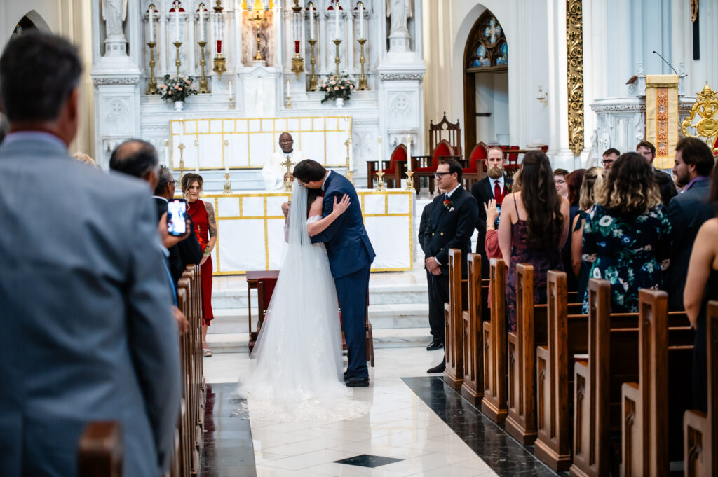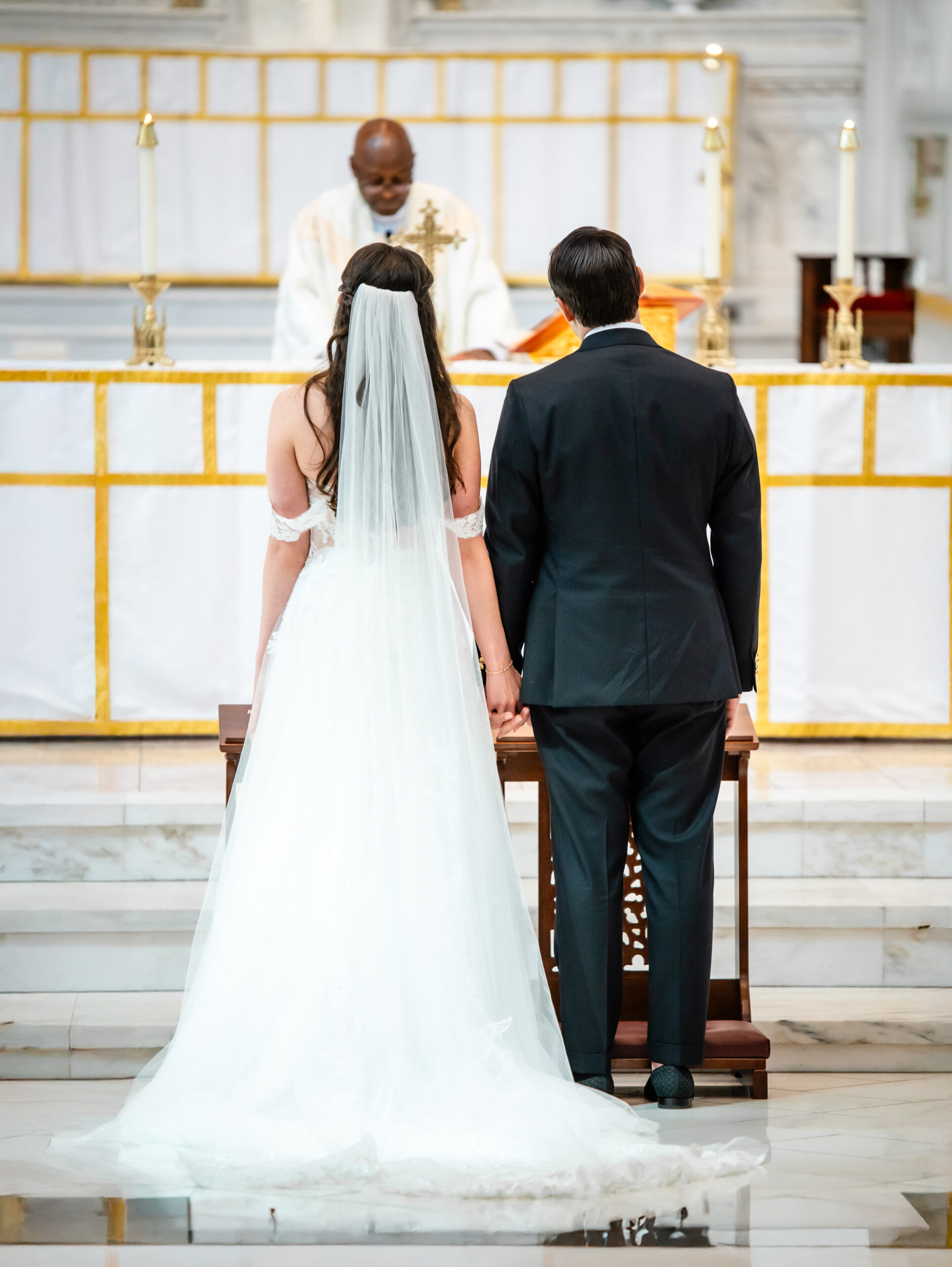 Their ceremony was a full Catholic wedding mass at the Cathedral Basilica of the Immaculate Conception. The space is absolutely stunning — soaring architecture, intricate gold details, beautiful light filtering through. The mass with communion felt deeply meaningful and reverent, but still carried their relaxed spirit somehow. It was a beautiful balance.