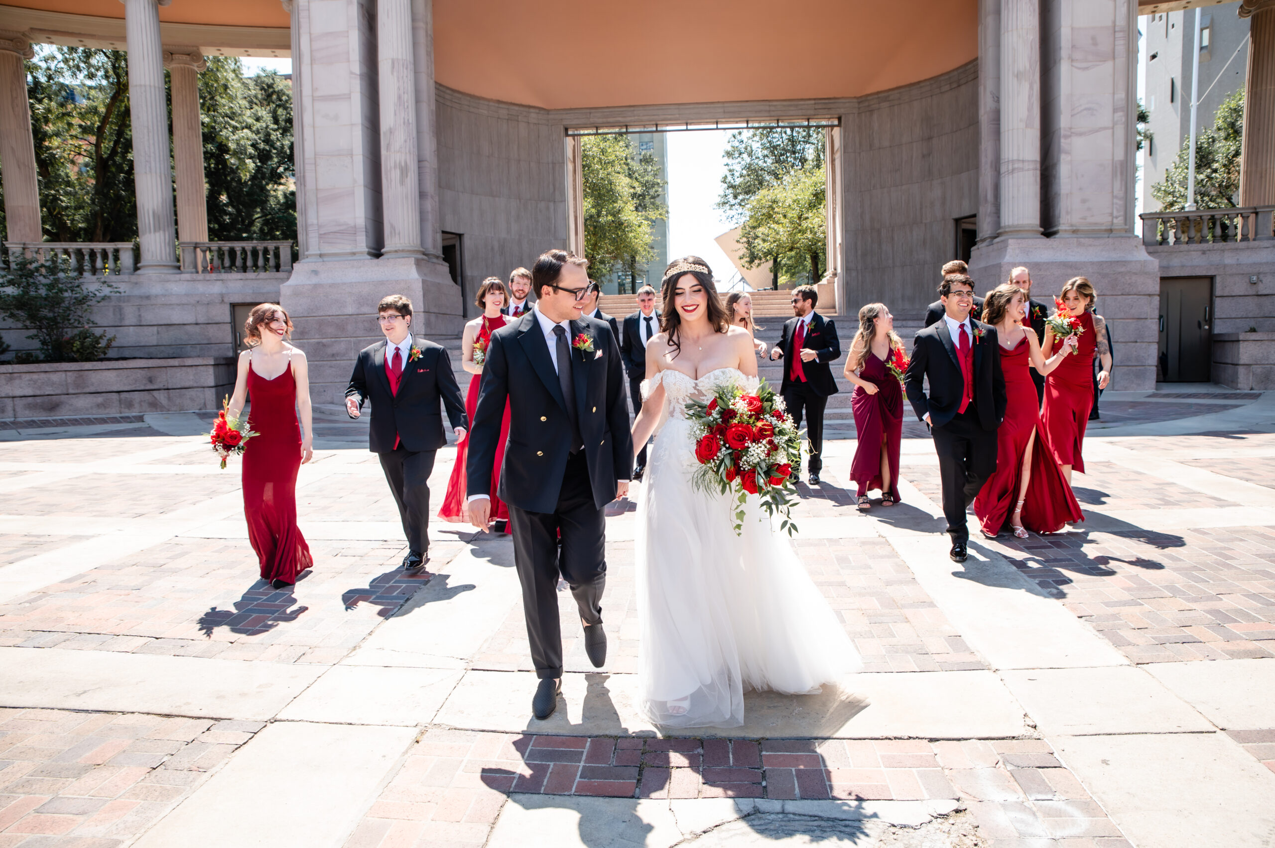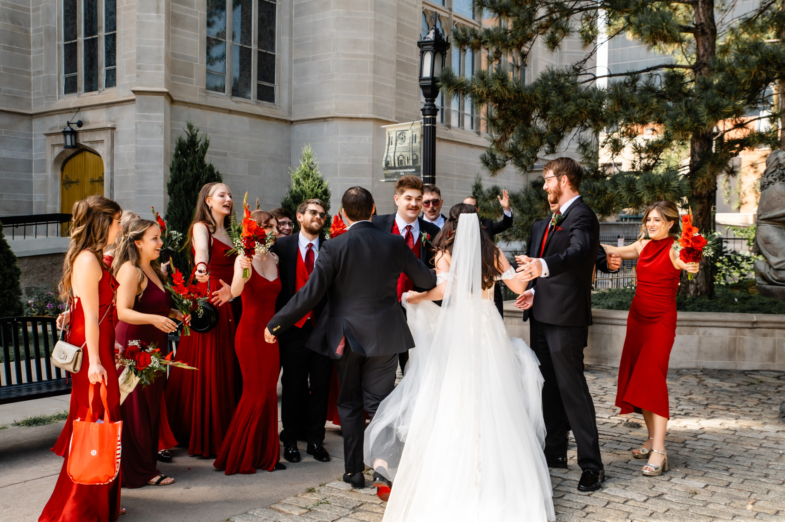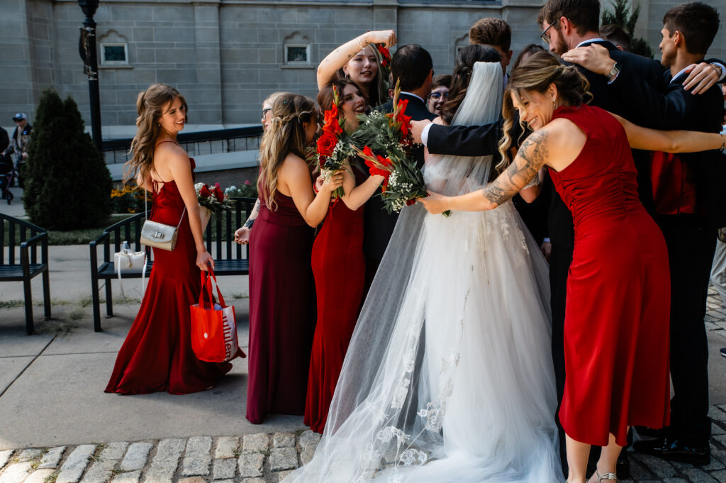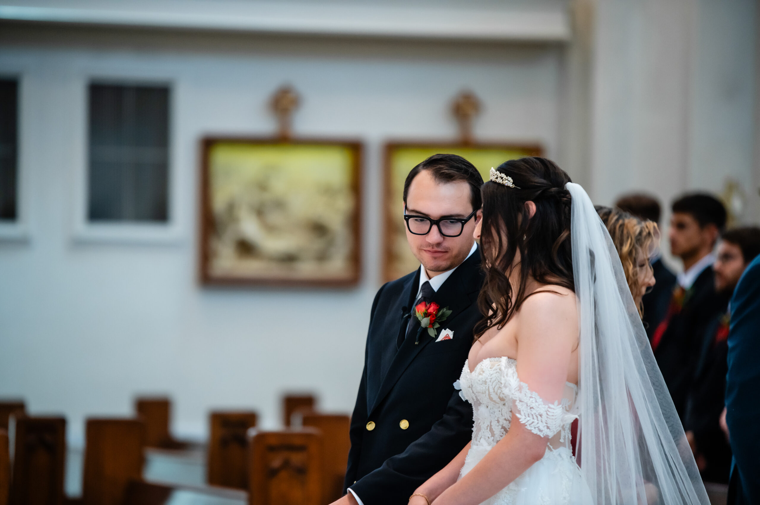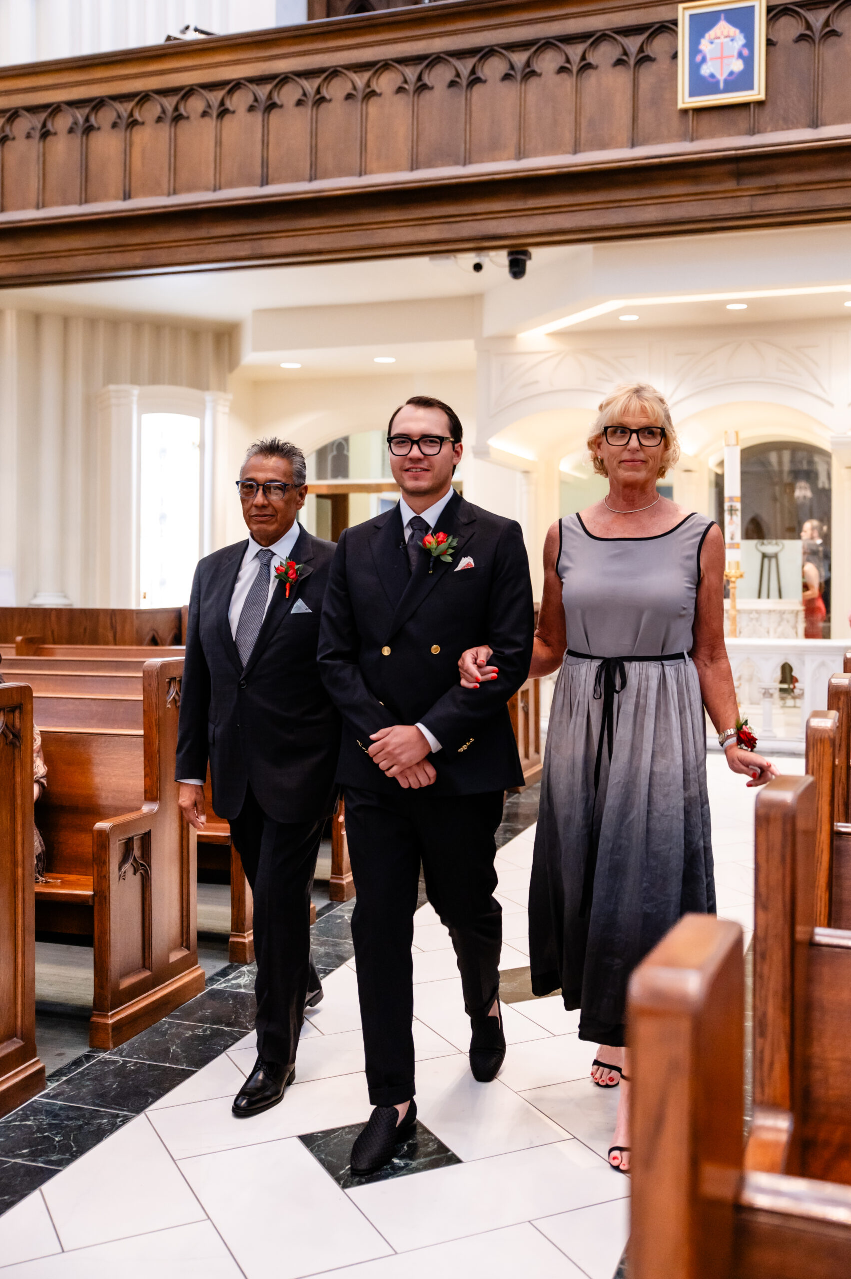 Their ceremony was a full Catholic wedding mass at the Cathedral Basilica of the Immaculate Conception. The space is absolutely stunning — soaring architecture, intricate gold details, beautiful light filtering through. The mass with communion felt deeply meaningful and reverent, but still carried their relaxed spirit somehow. It was a beautiful balance.